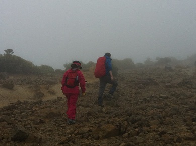 霧の中の登山は何も見えず、途中何度も心が折れそうになりました。