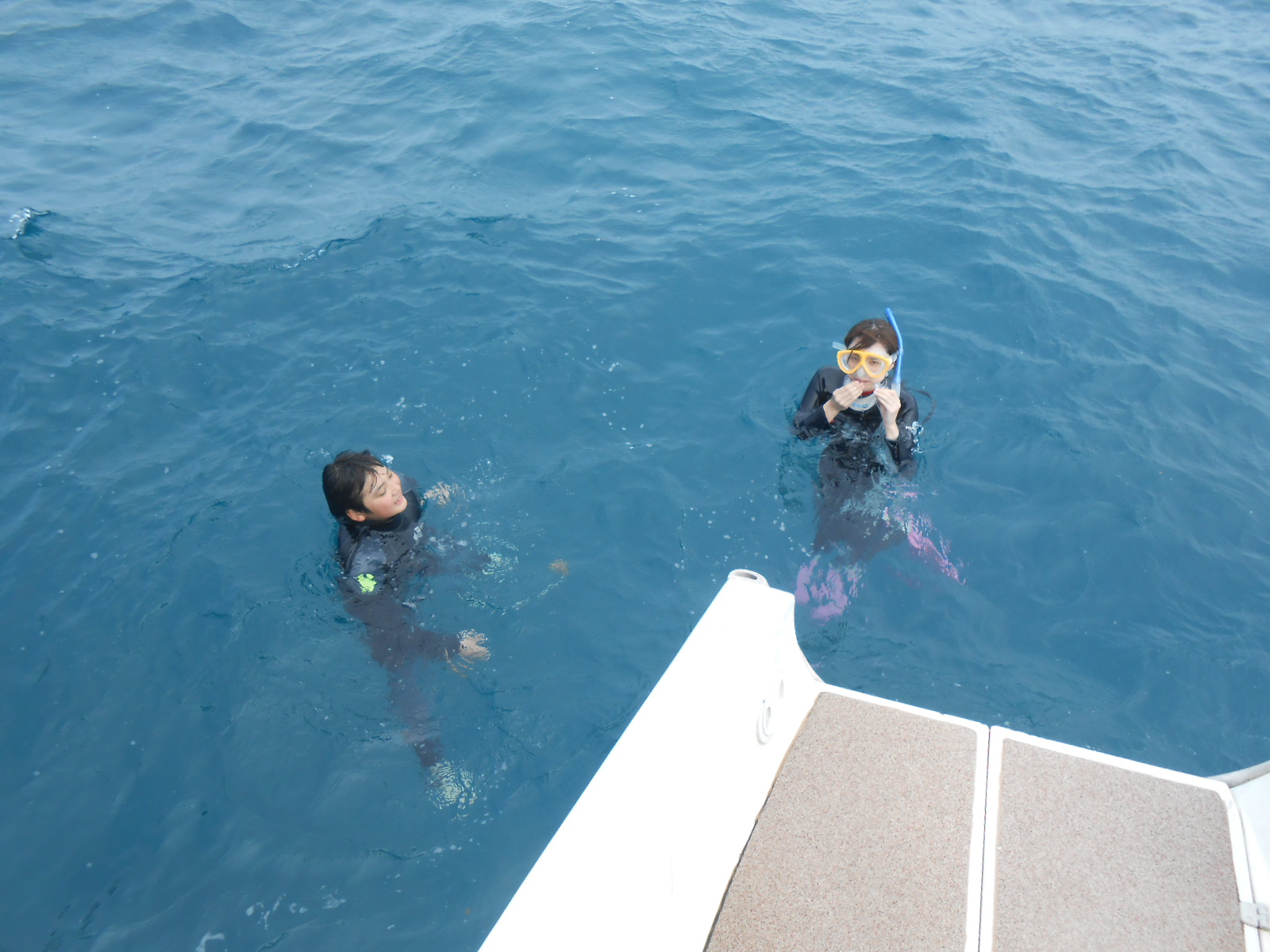 シュノーケリングになのに怖くて浮き輪が手放せず。 仲良くなった男の子に『絶対浮くから大丈夫。』 子どものほうがたくましいですね♪ |